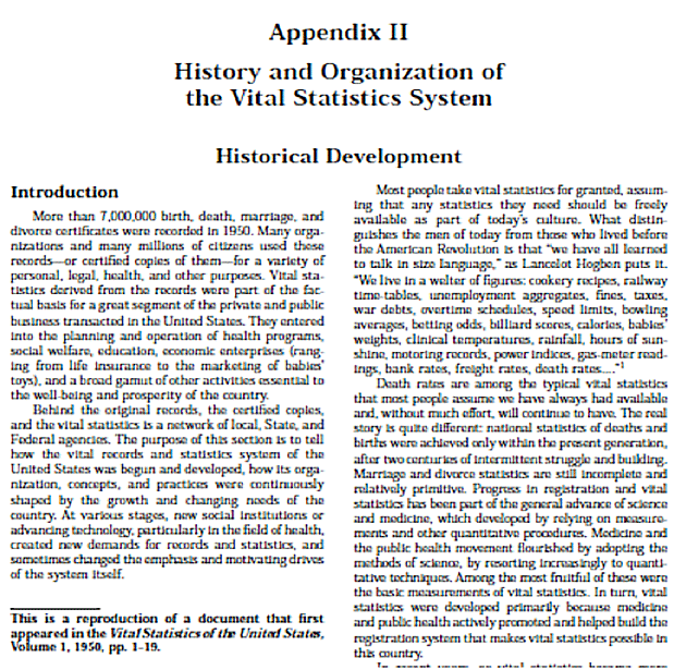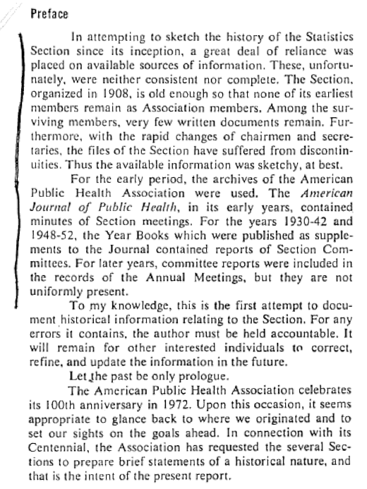 The Vital Statistics Section was formed before the current Journal, AJPH series began. But a few articles may illustrate that as often attributed to Harry S Truman while… “There is nothing new under the sun except the history you have not read yet”, this bromide equally applies to public health themes and challenges. Relevant to Applied Health Statistics history is the 1919 Paper by C. St. Clair Drake – assuredly rings a bell as clearly today as in 1919, the lead heading tells it all… and if anything more compelling in this age of graphic interfaces, skimming, and tweets.